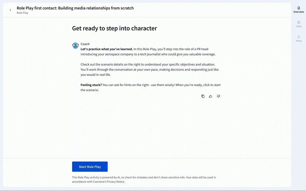 - Role Play, announced at Coursera Connect and recently launched, is our new AI-driven course activity that helps learners develop critical skills by practicing in realistic workplace simulations. In this safe space, learners can apply learned concepts, get personalized, constructive feedback, and build confidence to improve their on-the-job performance.